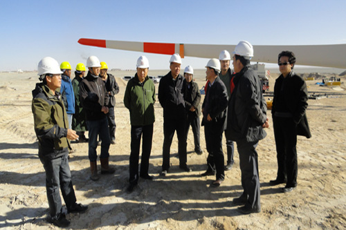 在茫崖一期20兆瓦风电场建设工地,集团领导察看了已完成吊装的首台风机,并听取了茫崖风电有限公司总经理支永新和工程承包方代表关于施工组织、设备安装和调试等情况的介绍,观看了第二台风机机舱的吊装施工,检查了正在施工中的110KV变电所、高压线路、综合楼。王海青、姚铁兵代向建设一线的同志们赠送了慰问品,对他们的辛勤付出表达了敬意和感谢。王总经理指出,茫崖风电场2.5兆瓦风电机组是目前省内海拔最高、单机容量和叶轮直径最大的机组,也是青海水电集团独立开发的第一个风电项目,对集团新能源业务的发展具有重大意义。各参建单位要高度重视,同心协力,克服自然条件艰苦等不利因素,在确保安全和质量的前提下,加快工程进度,并及时办理并网许可等前期手续,争取早日投产发电。